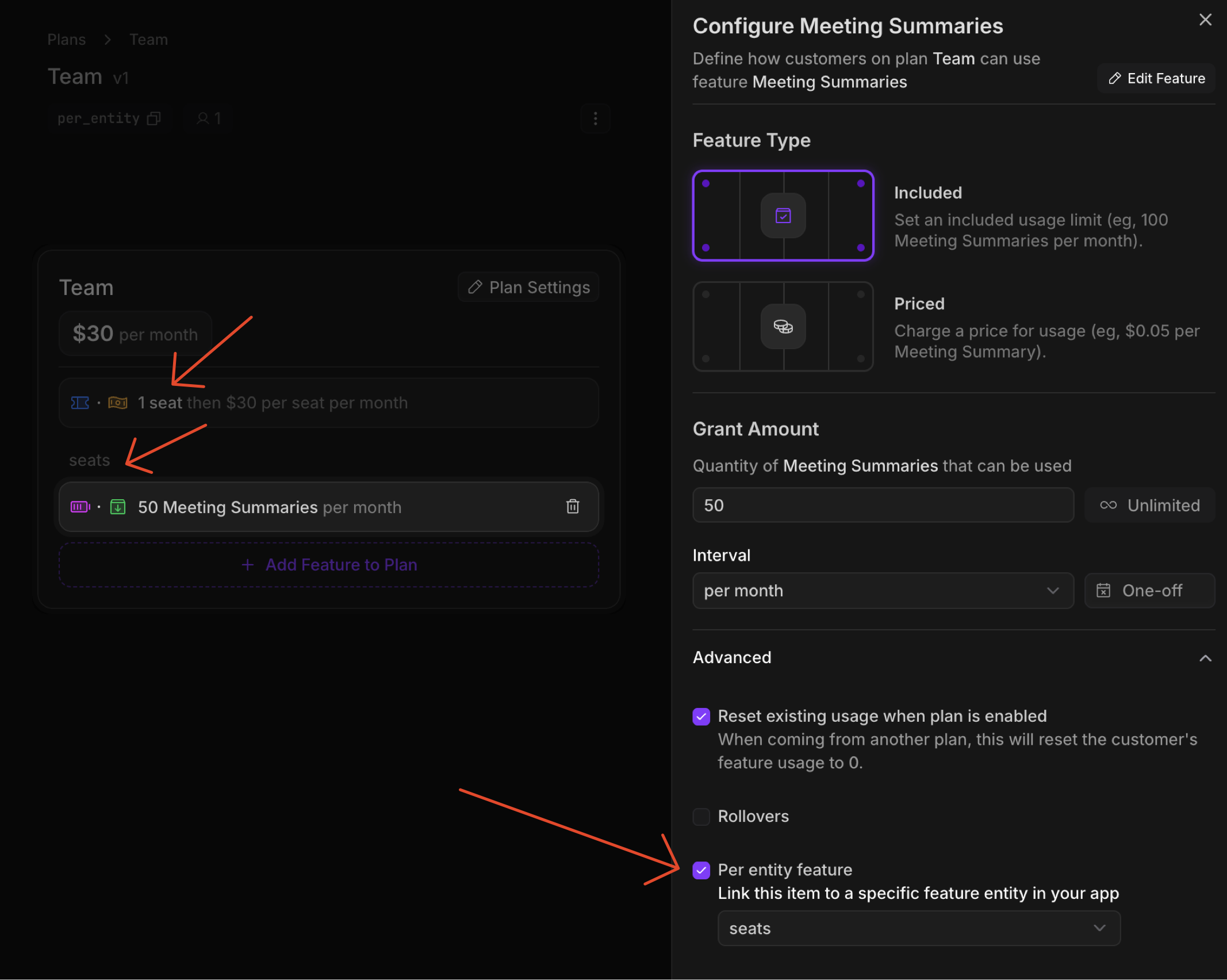 - Meeting Summaries: 50 per month, linked to the Seats feature as a per-entity feature, under “Advanced”