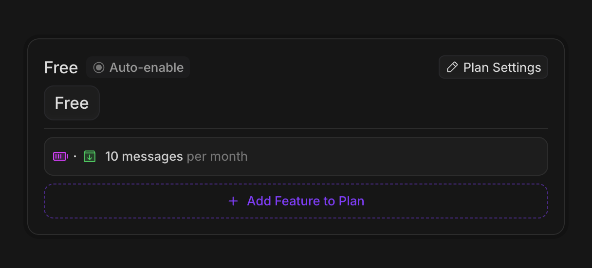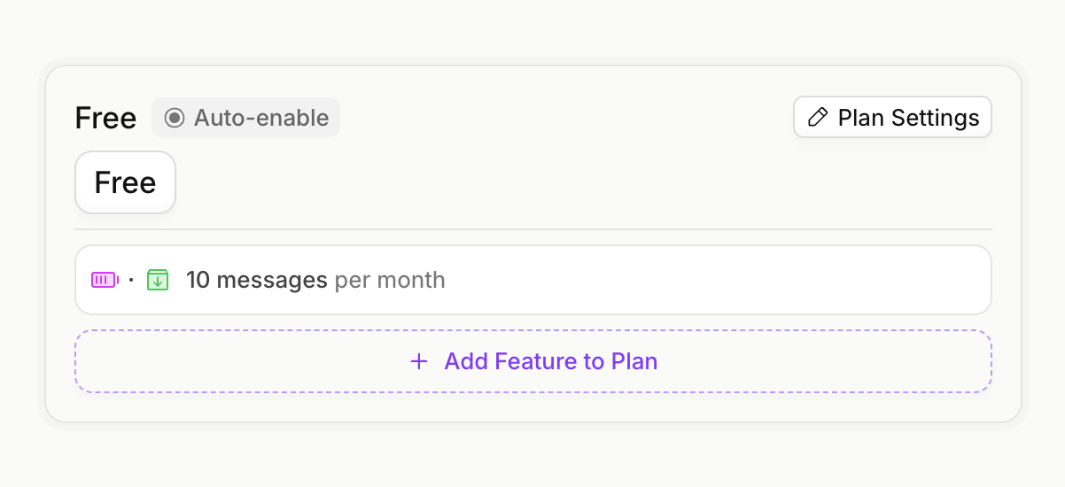 Free PlanCreate a free plan, and assign 10 messages to it. We’ll add an interval of “month”, so that the user is granted 10 periodically.
