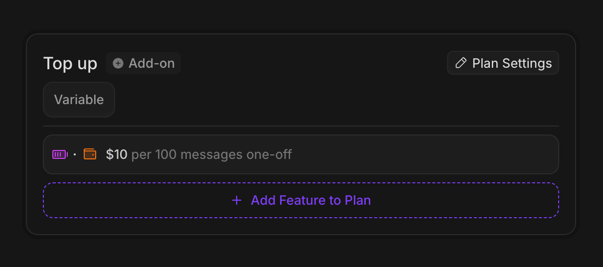 prepaid price of $10 per 100 messages.Since these messages have interval “one-off”, the messages will last forever (unlike our Free plan messages, which reset every month).Features with a prepaid price require a quantity to be passed in when a customer purchases the plan, so the customer can specify how many messages they want to top up with.