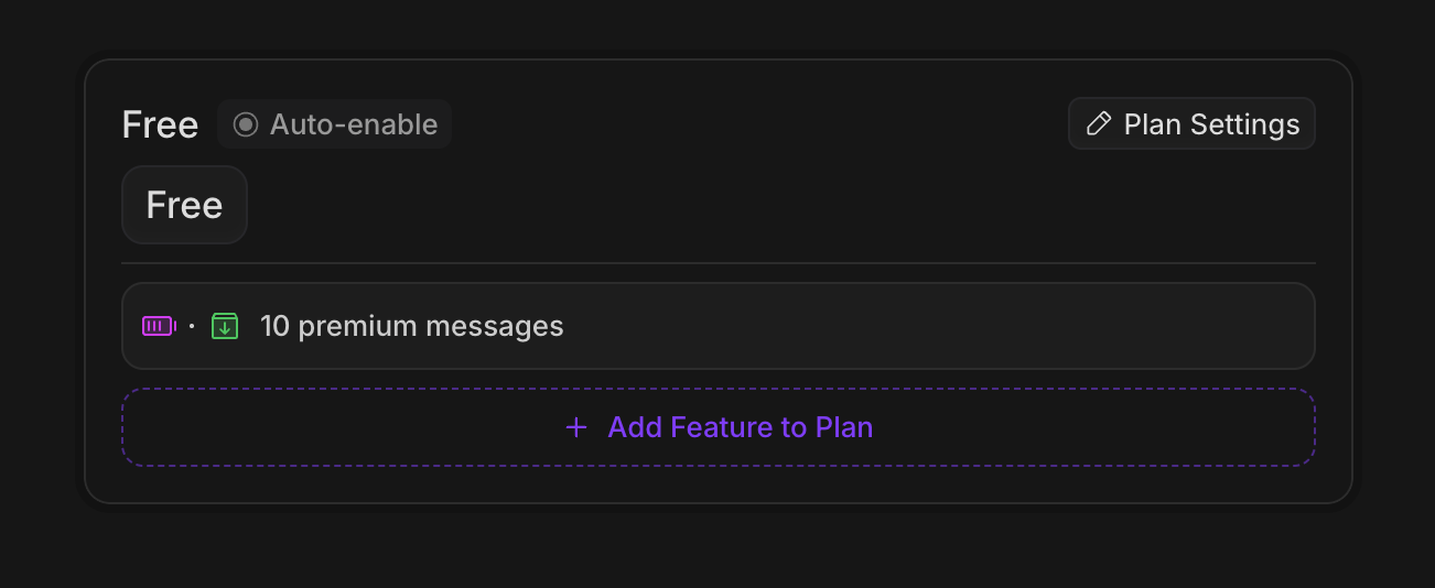 Create our free plan, and assign 10 premium messages to it. These are “one-off” credits, that will not reset periodically.