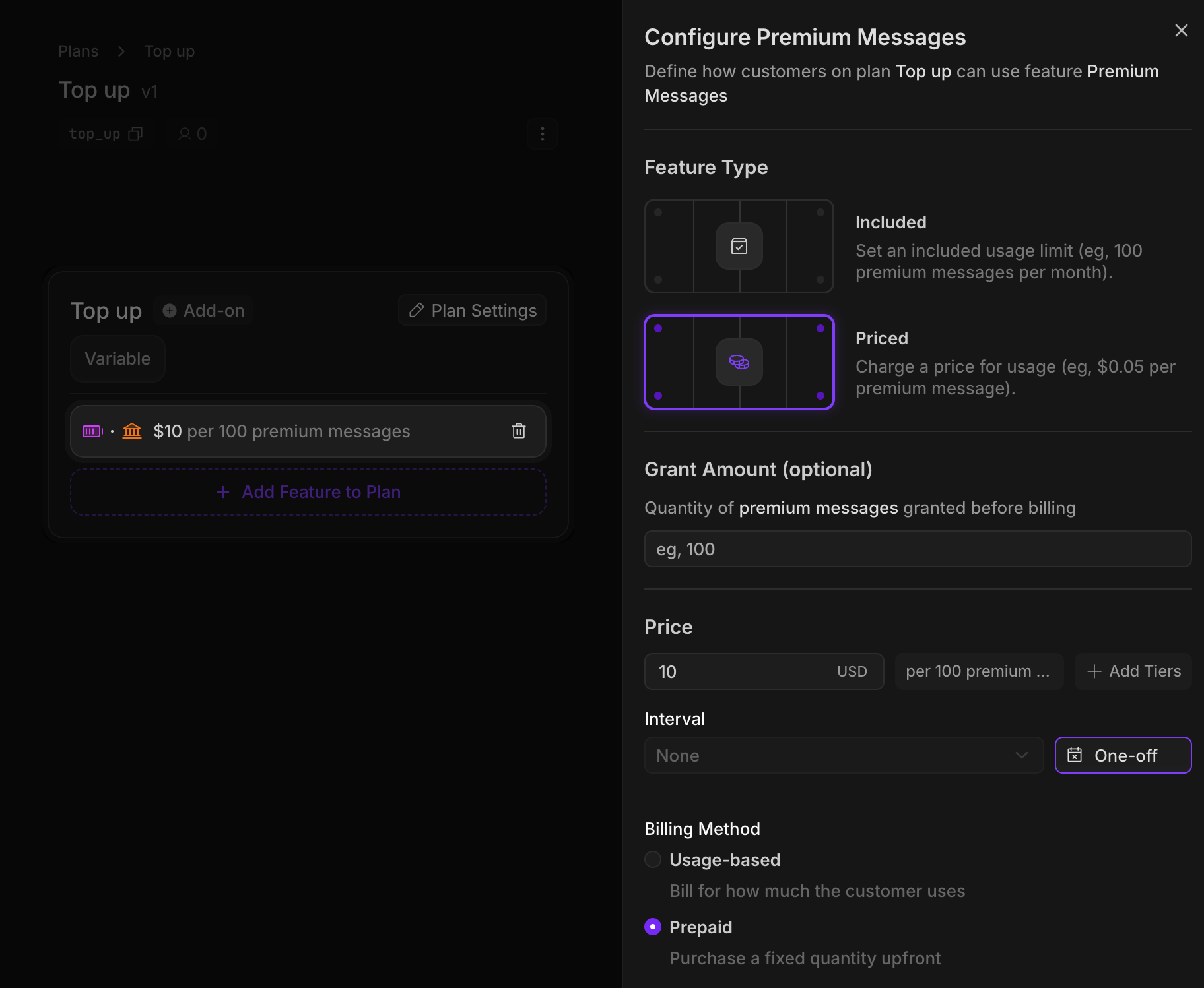 prepaid billing method.prepaid features require a quantity to be sent in when a customer attaches this product, so the customer can specify how many premium messages they want to top up with.