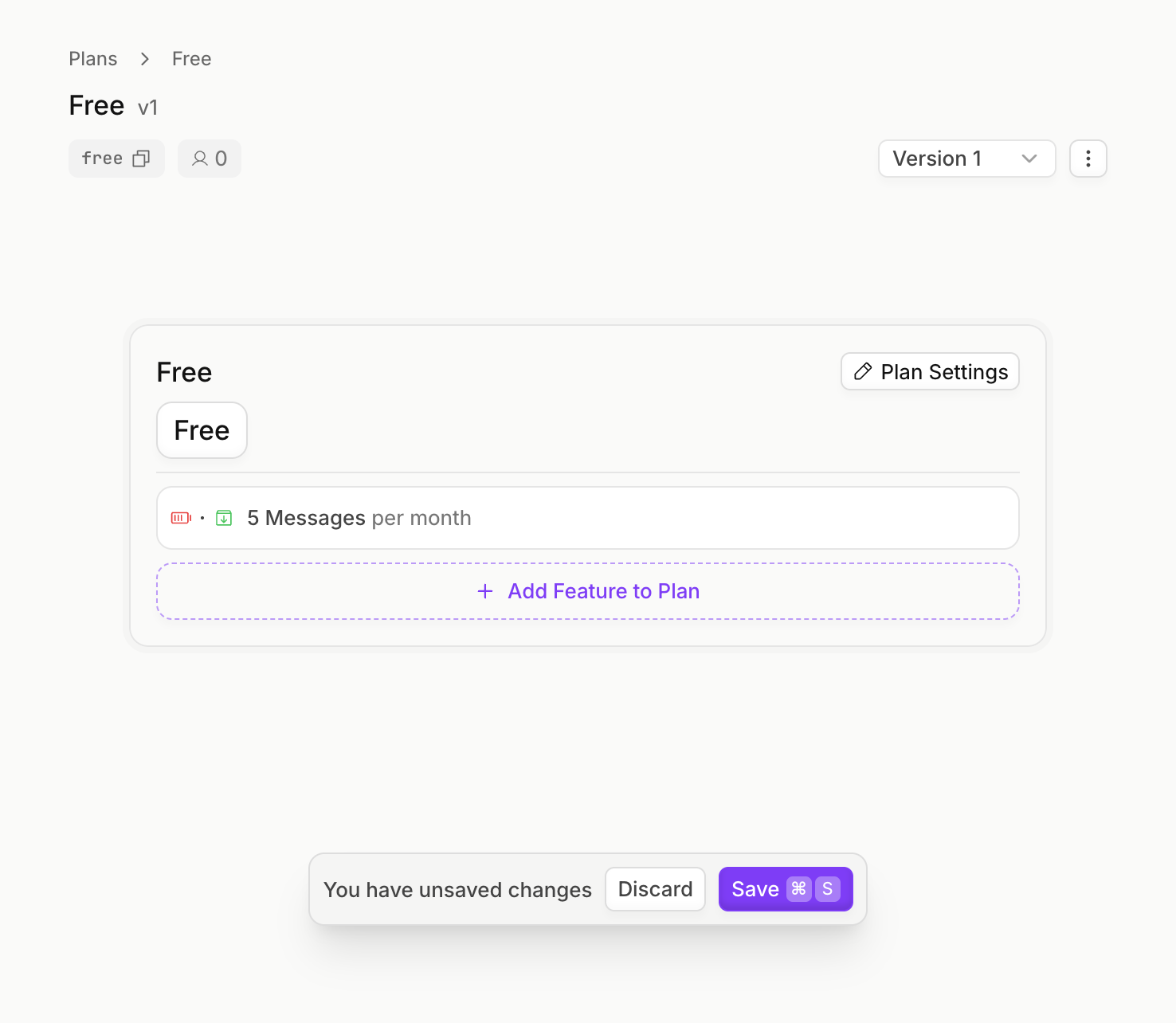 auto-enableflag, so that the plan is assigned whenever customers are created - In the plan editor, click Add Feature to Plan, and create a